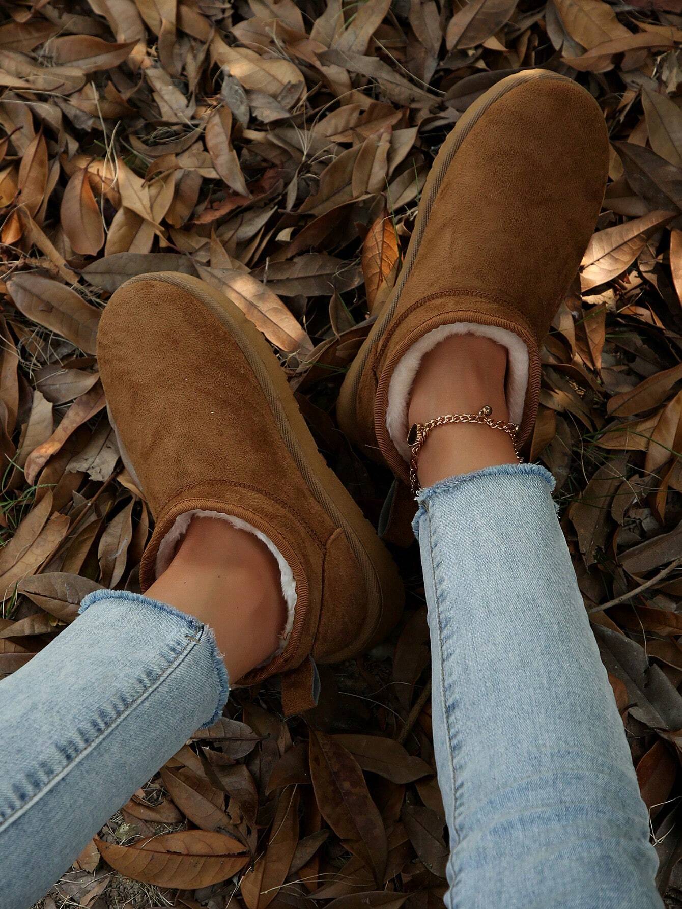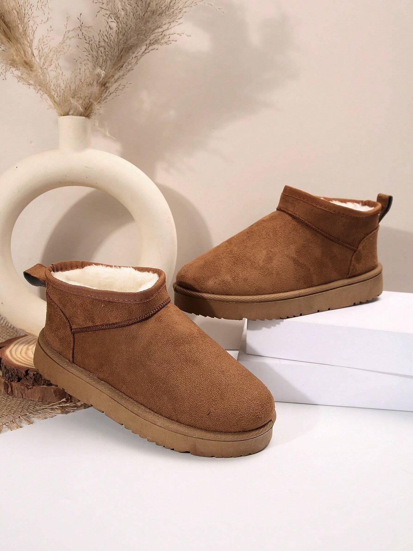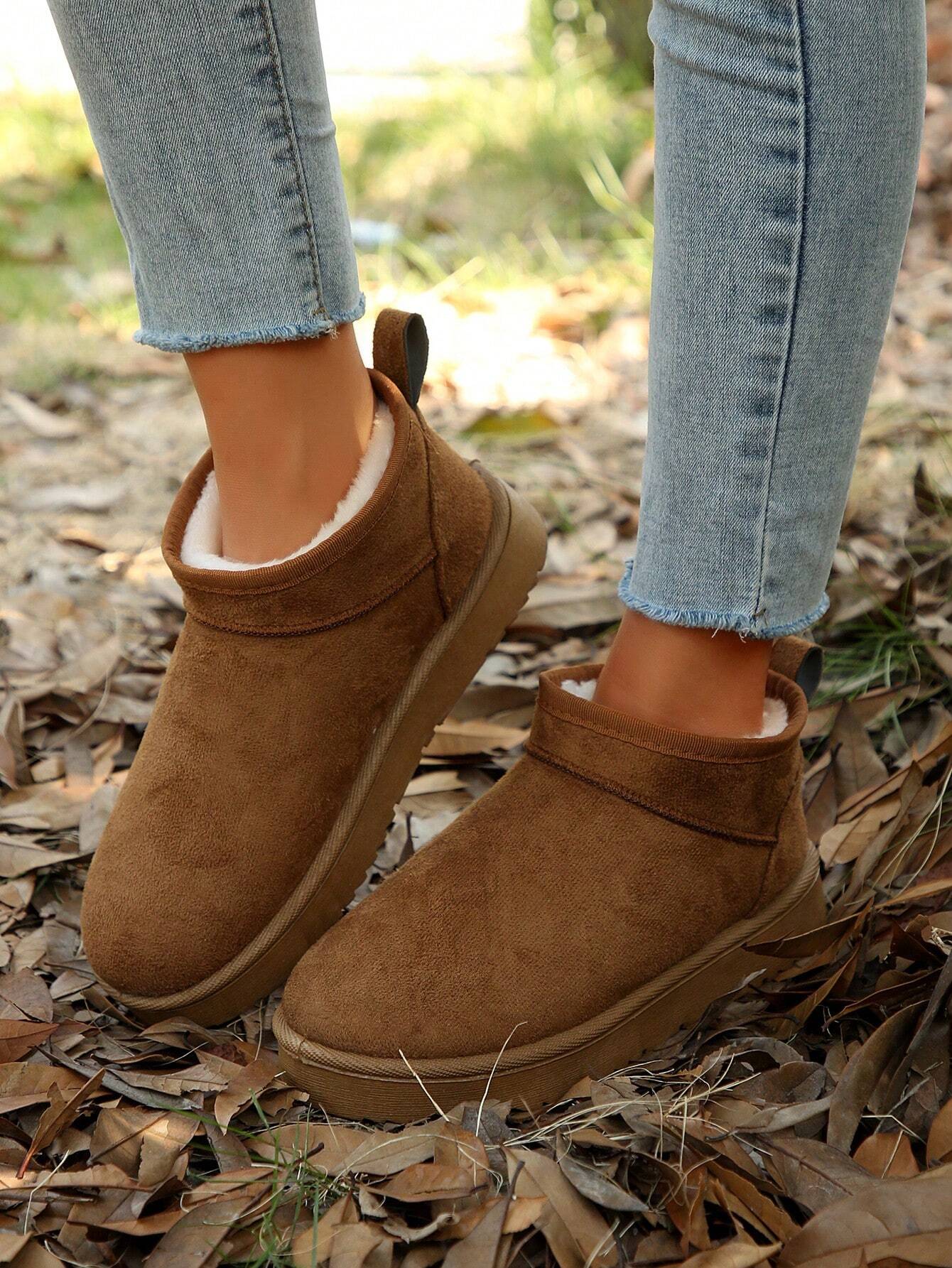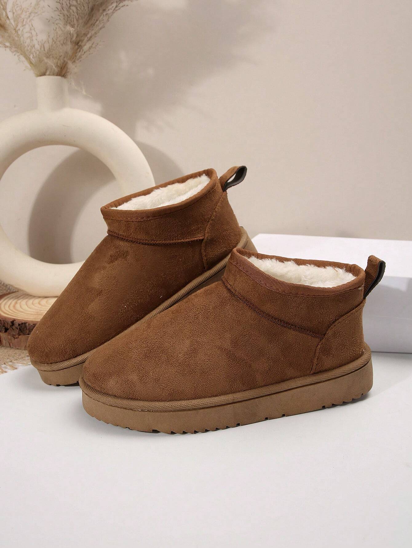 Die kurzen Winterstiefel bestehen aus Wildleder mit einem Innenfutter aus Baumwolle und einer dicken Gummisohle. Sie bieten guten Schutz gegen Kälte und sind bequem für den Alltag.