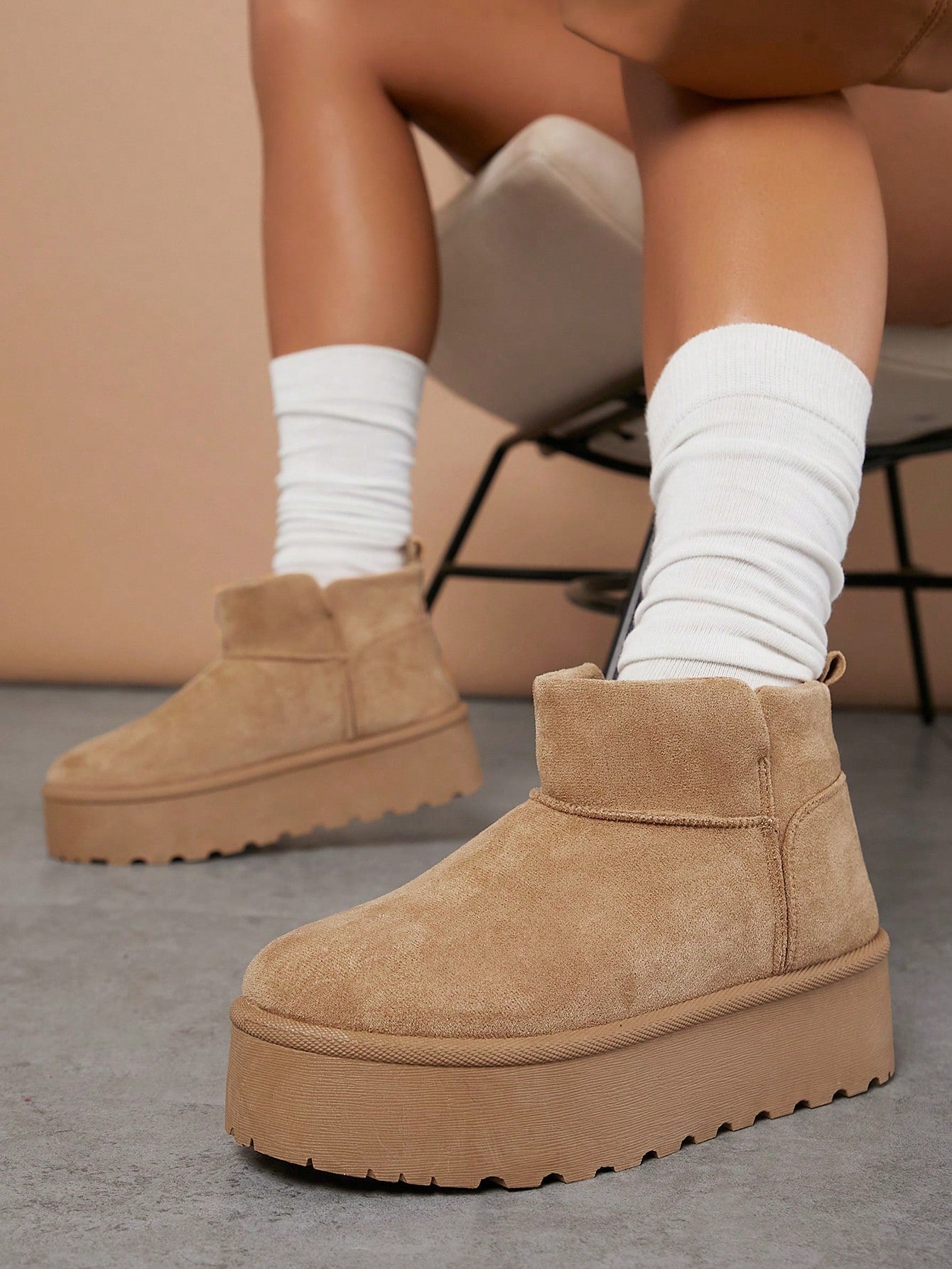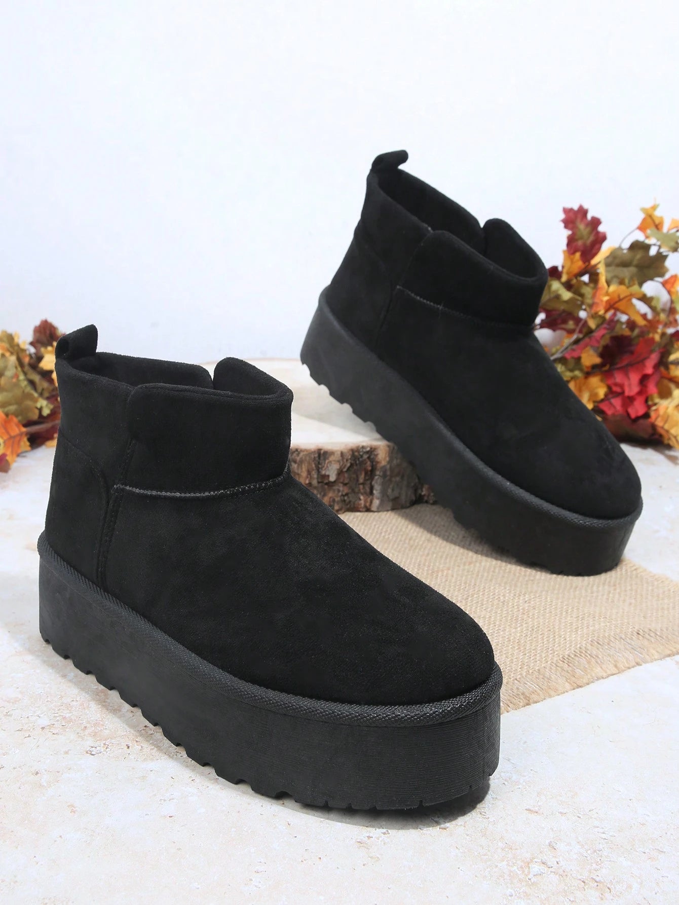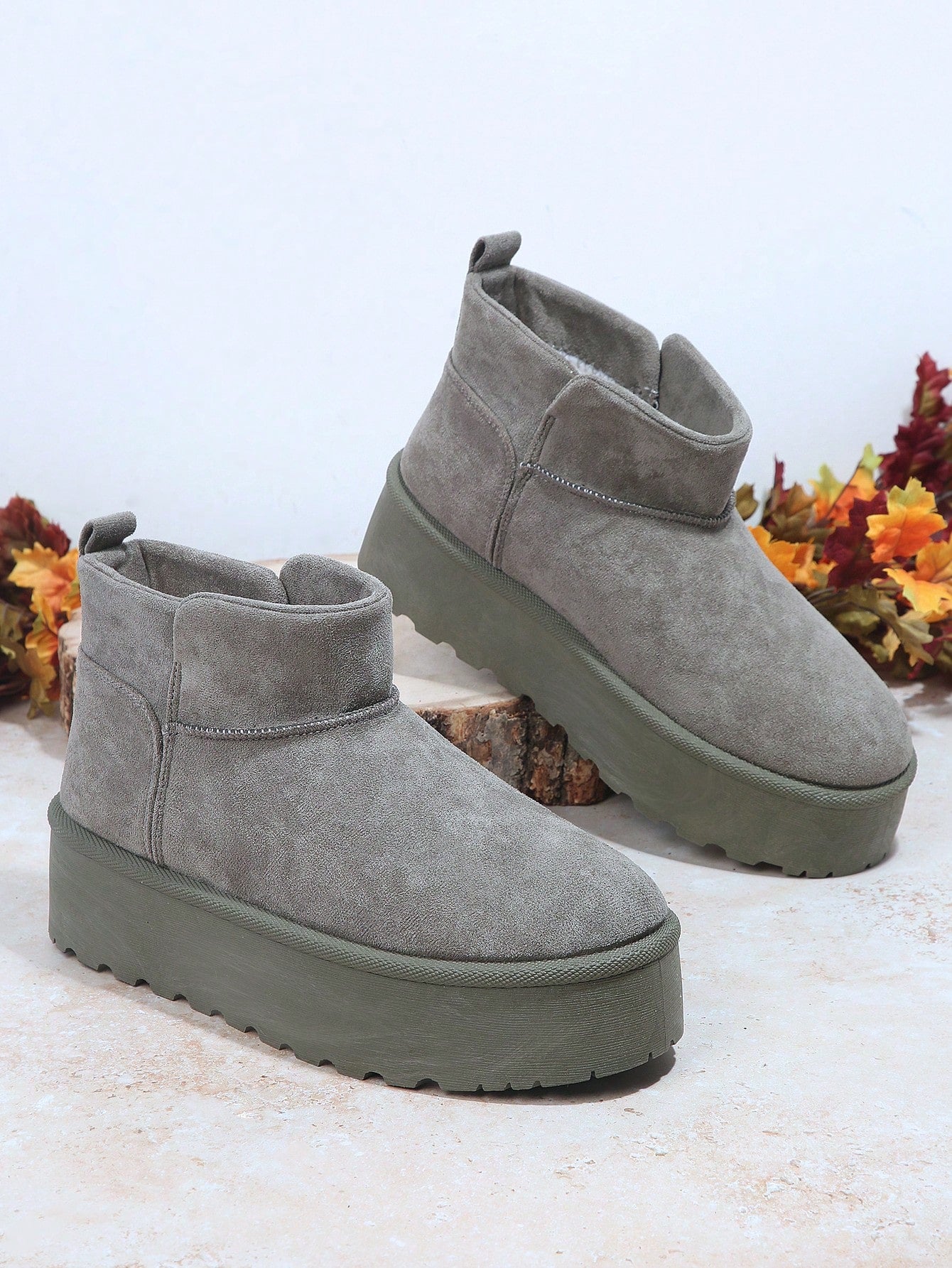 Die kurzen Winterstiefel bestehen aus Wildleder mit einem Innenfutter aus Baumwolle und einer dicken Gummisohle. Sie bieten guten Schutz gegen Kälte und sind bequem für den Alltag.