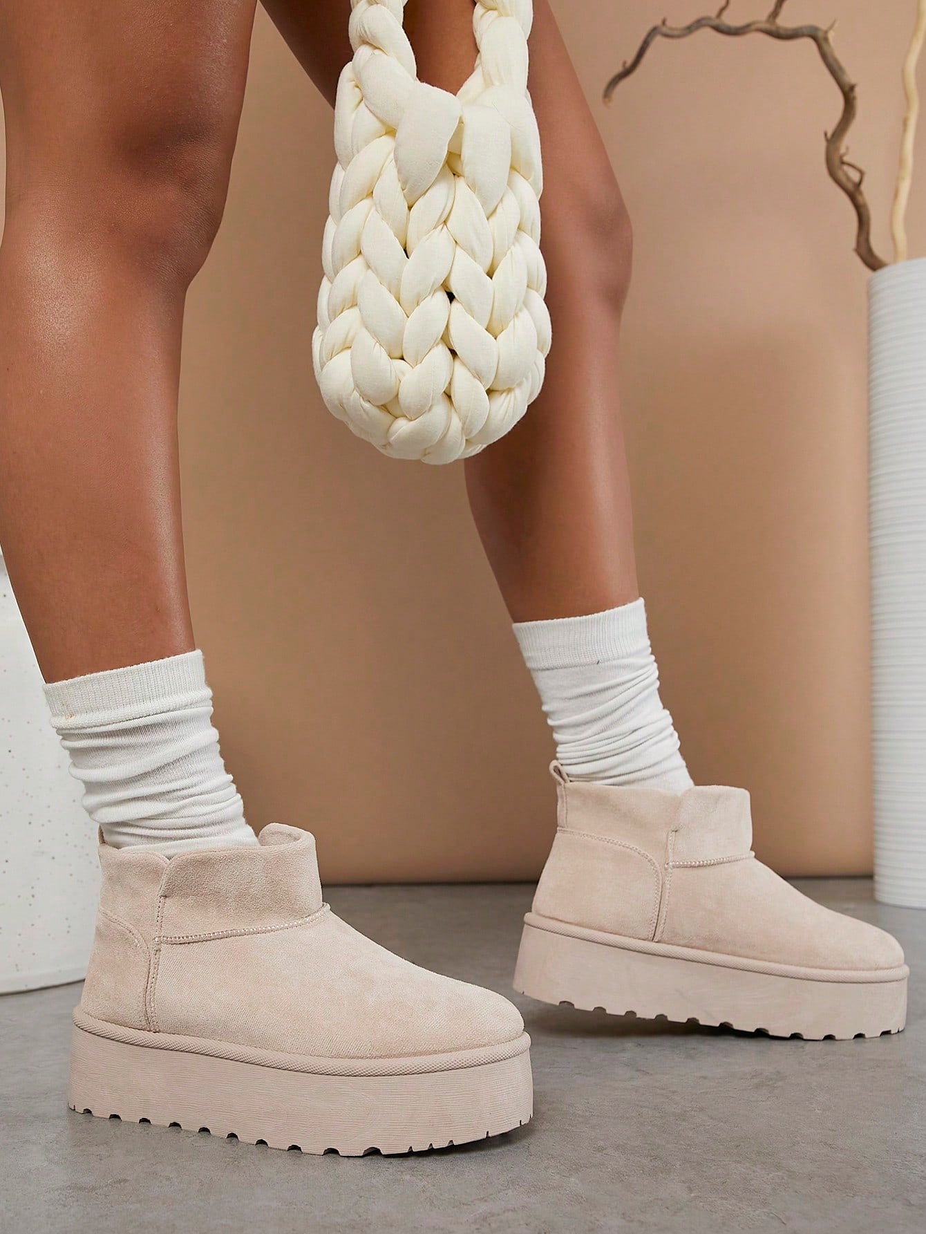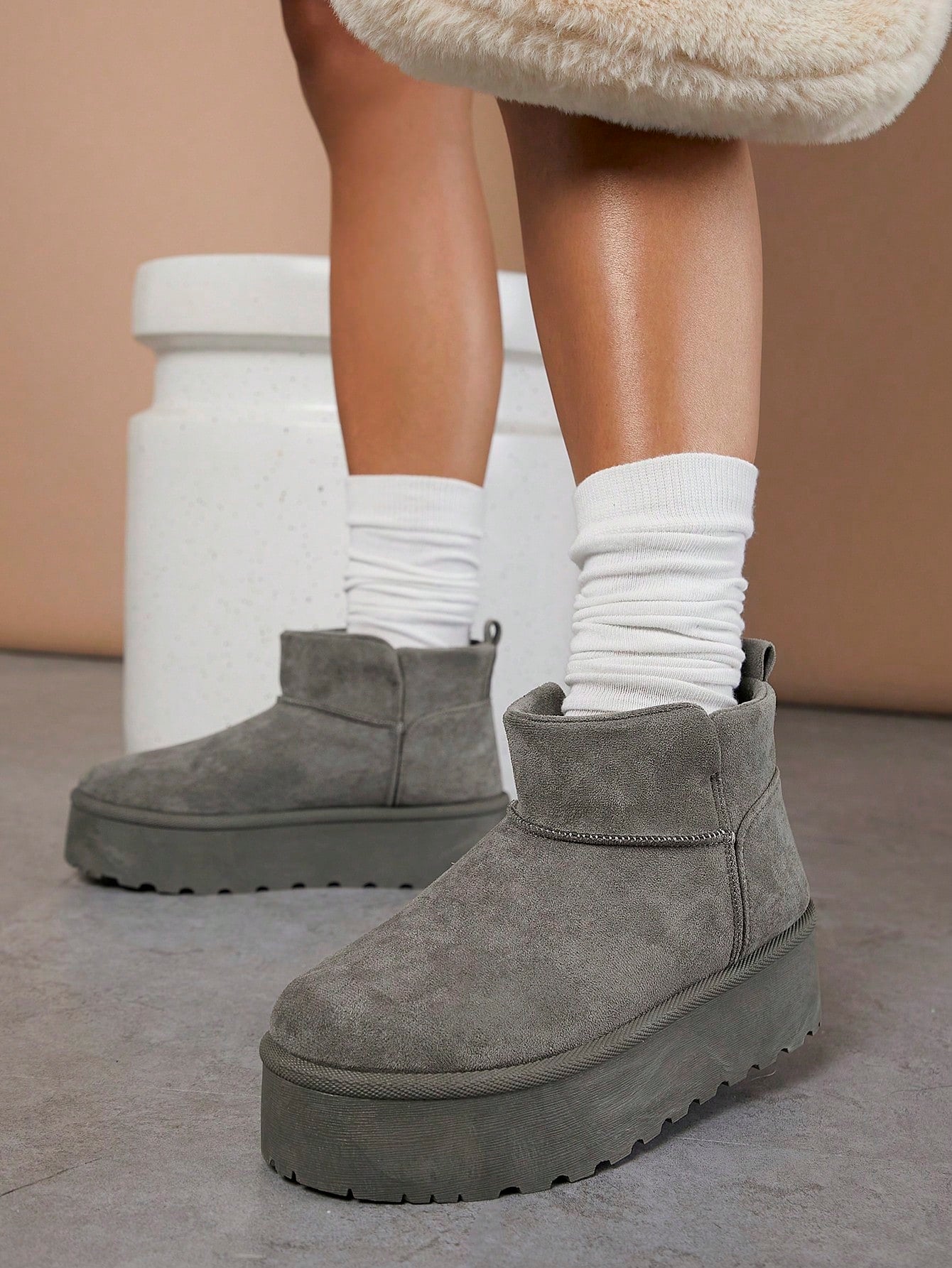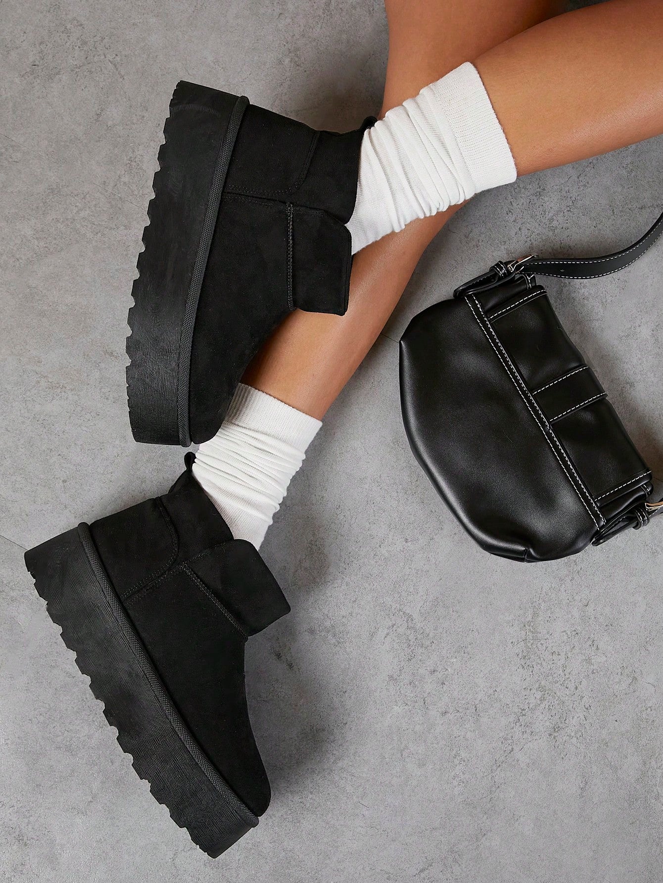 Die kurzen Winterstiefel bestehen aus Wildleder mit einem Innenfutter aus Baumwolle und einer dicken Gummisohle. Sie bieten guten Schutz gegen Kälte und sind bequem für den Alltag.